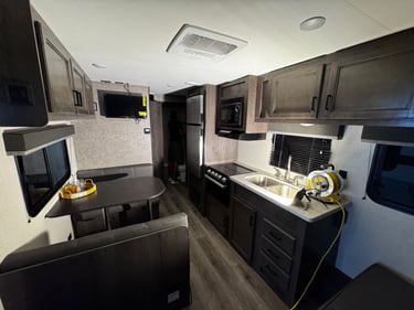 Equipped with a freshwater tank and hookups, power outlets, and propane tanks to meet your utility needs.